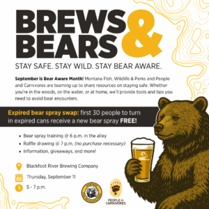 September is Bear Aware Month! Montana Fish, Wildlife & Parks and People and Carnivores are teaming up to share resources on staying safe. Whether you’re in the woods, on the water, or at home, we’ll provide tools and tips you need to avoid bear encounters.